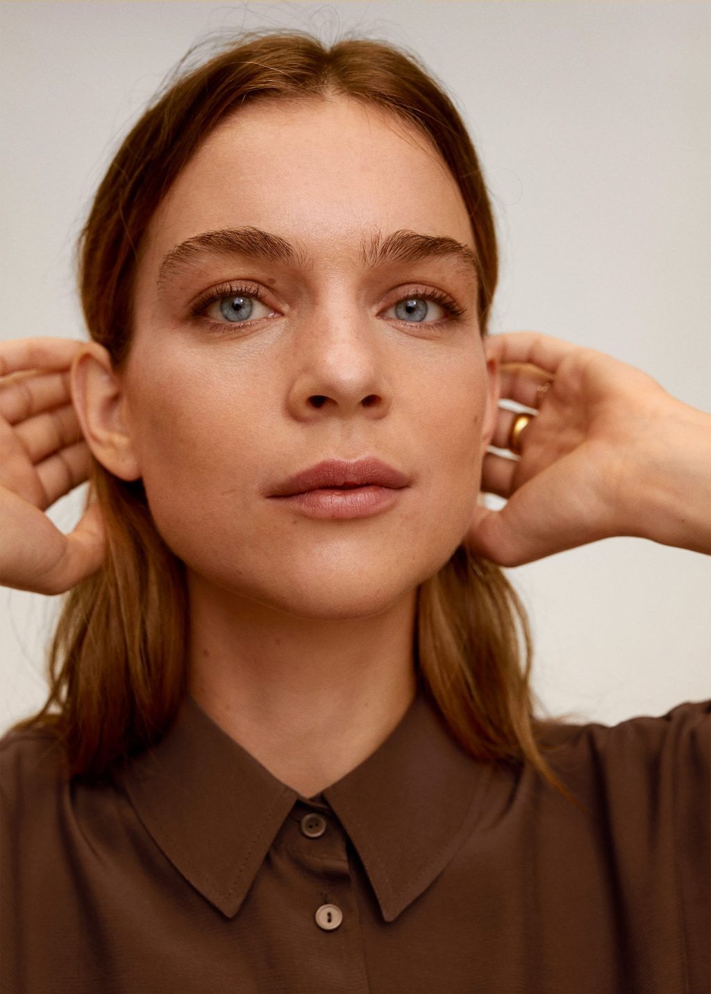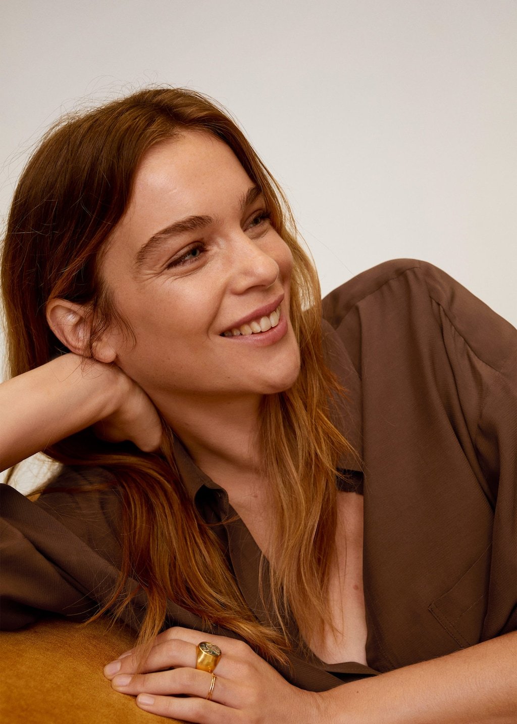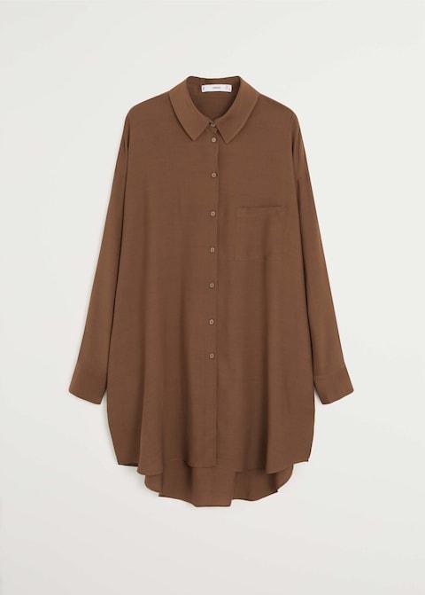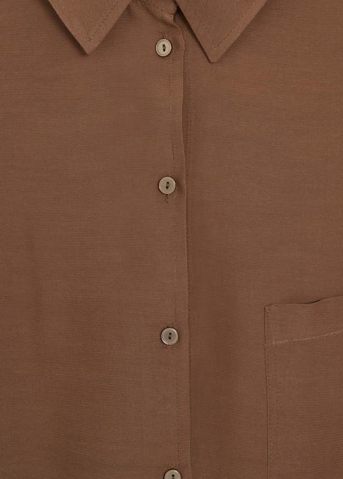 Flowy fabric. Oversize design. Classic collar. Button up. Long buttoned sleeve. Patch pocket.