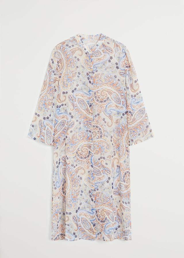 Flowy fabric. Long design. Paisley design. Mao neckline. Three quarters wide sleeves. Side slits. Button fastening on the front section.