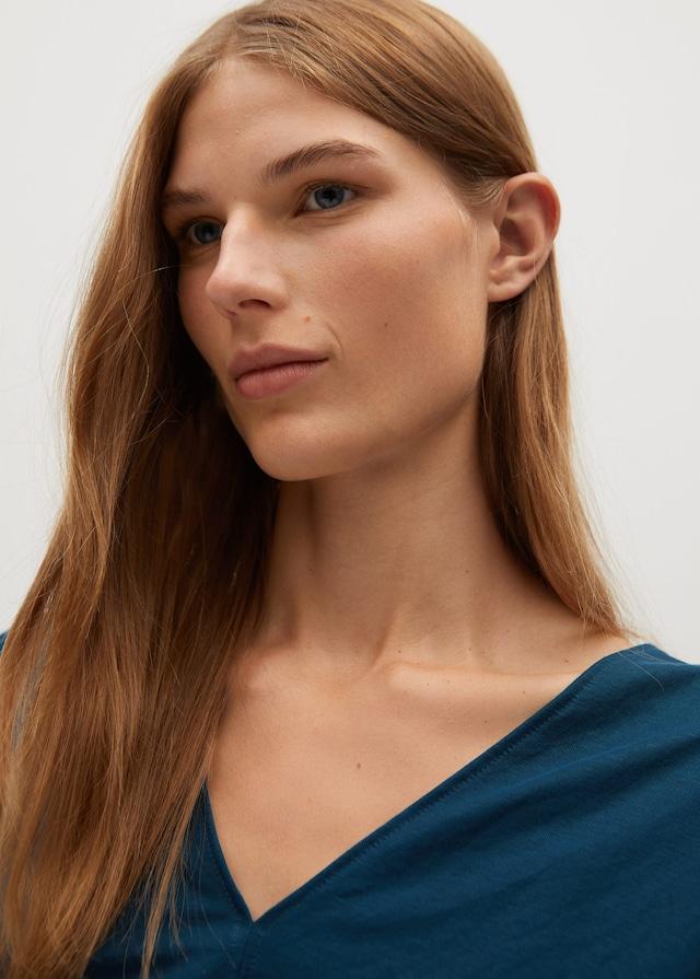 Short design. V-neck. Long puffed sleeves. Elastic cuffs. Decorative pleats at front.