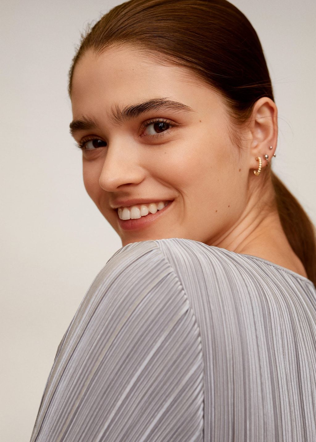 Long design. Semi-flared hem. Pleated fabric. V-neck. Long sleeve. Decorative knot.