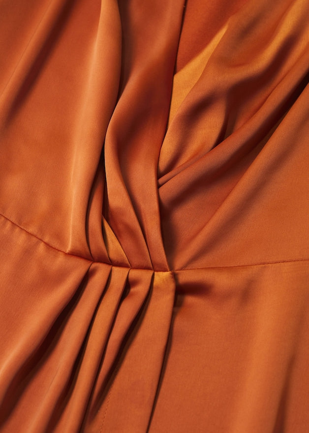 Flowy fabric. Satin finish. Midi design. Flared design. Crossed V-neck. Long sleeve. Pleated details. Front slit. Party collection.
