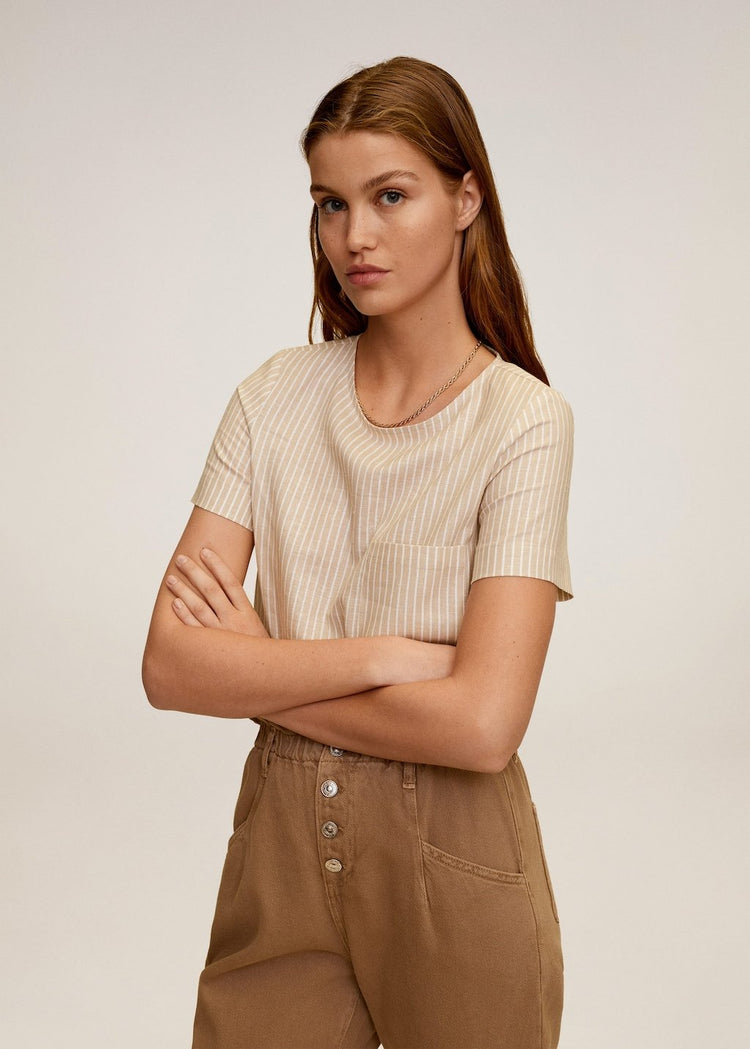 Fabric with linen. Chest pocket. Rounded neck. Short sleeve.