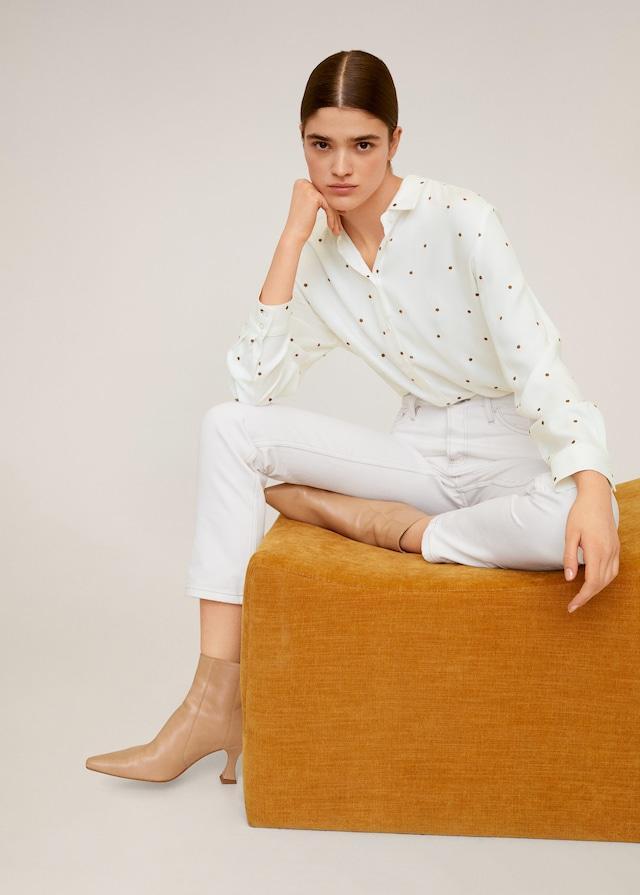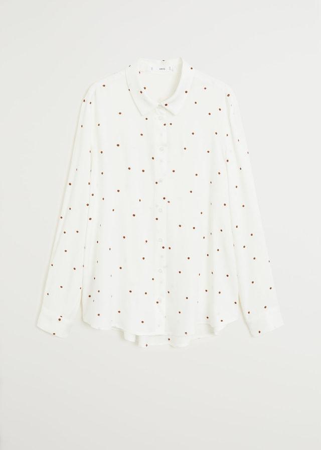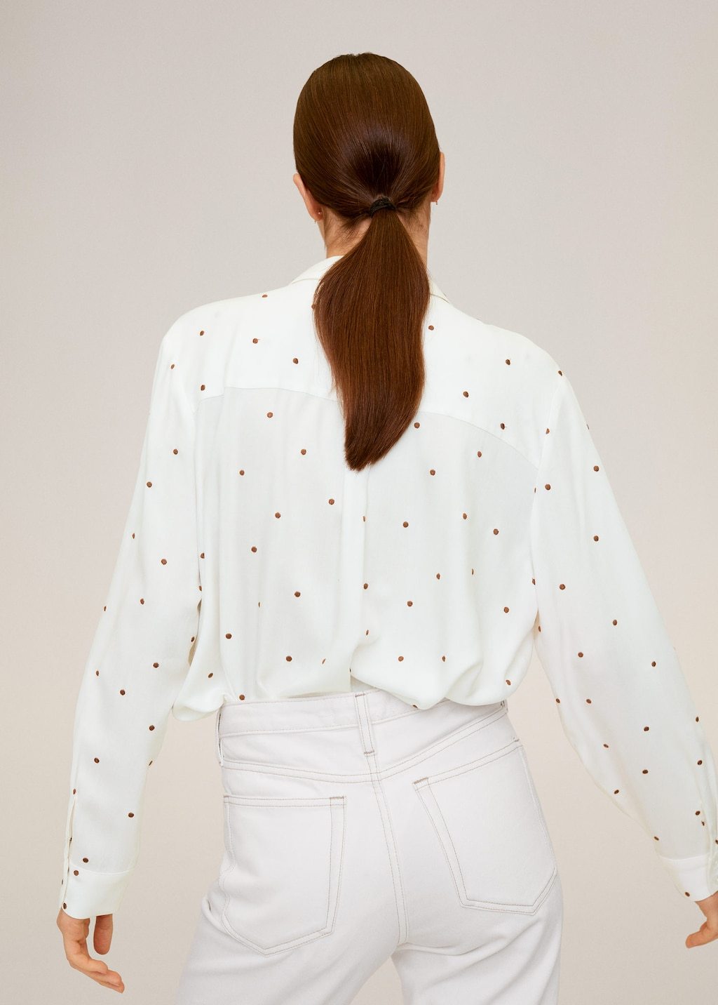 Flowy fabric. Embroidered dots. Classic collar. Long sleeve. Buttoned cuffs. Button up.