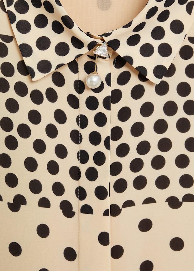 Flowy fabric. Shirt-style. Polka-dot pattern. Faux pearl button fastening. Lapel-collar. Long sleeve with buttoned cuffs. Loops. Removable printed belt. Concealed button fastening. Flared design.