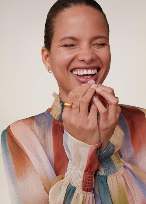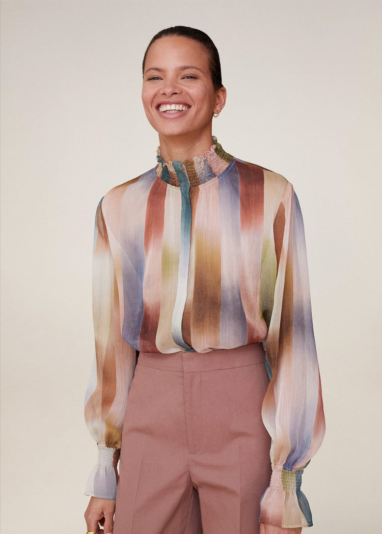 Flowy fabric. Print. High collar. Long sleeve with elastic cuffs. Button fastening on the front section.