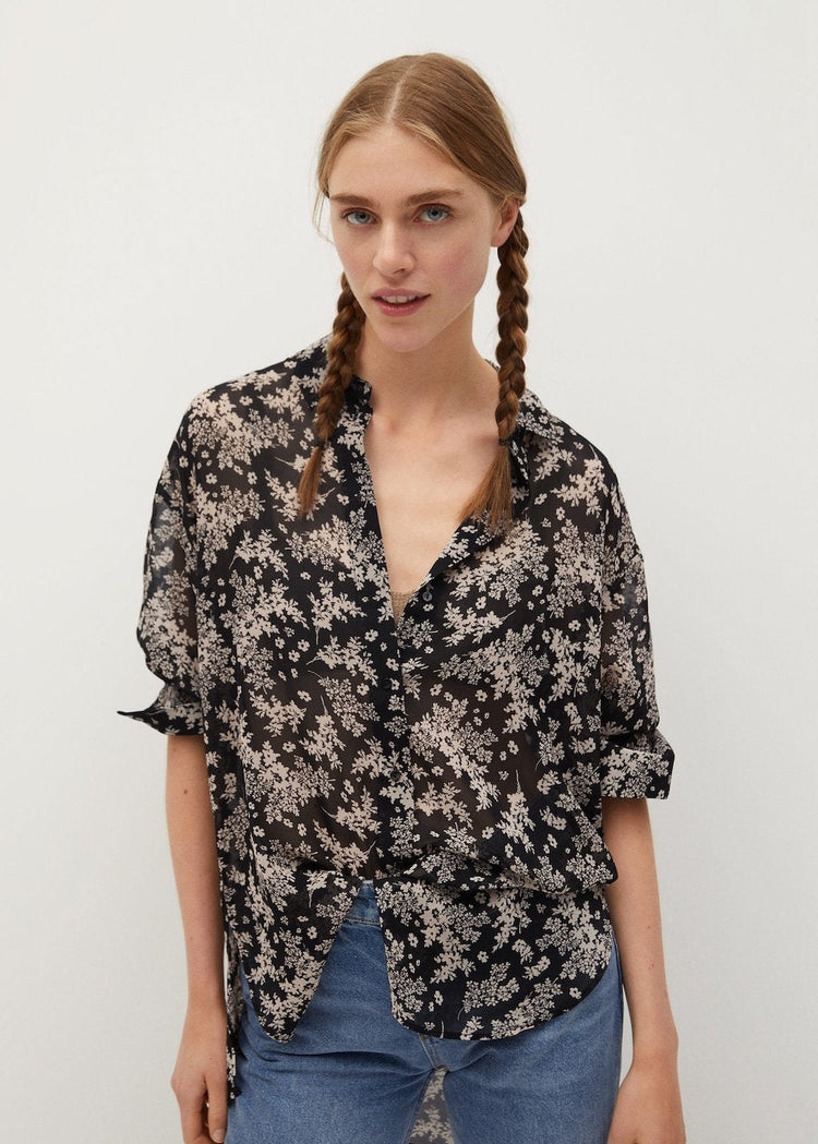 Flowy fabric. Sheer fabric. Printed design. Classic collar. Long sleeve. Buttoned cuffs. Concealed button fastening.