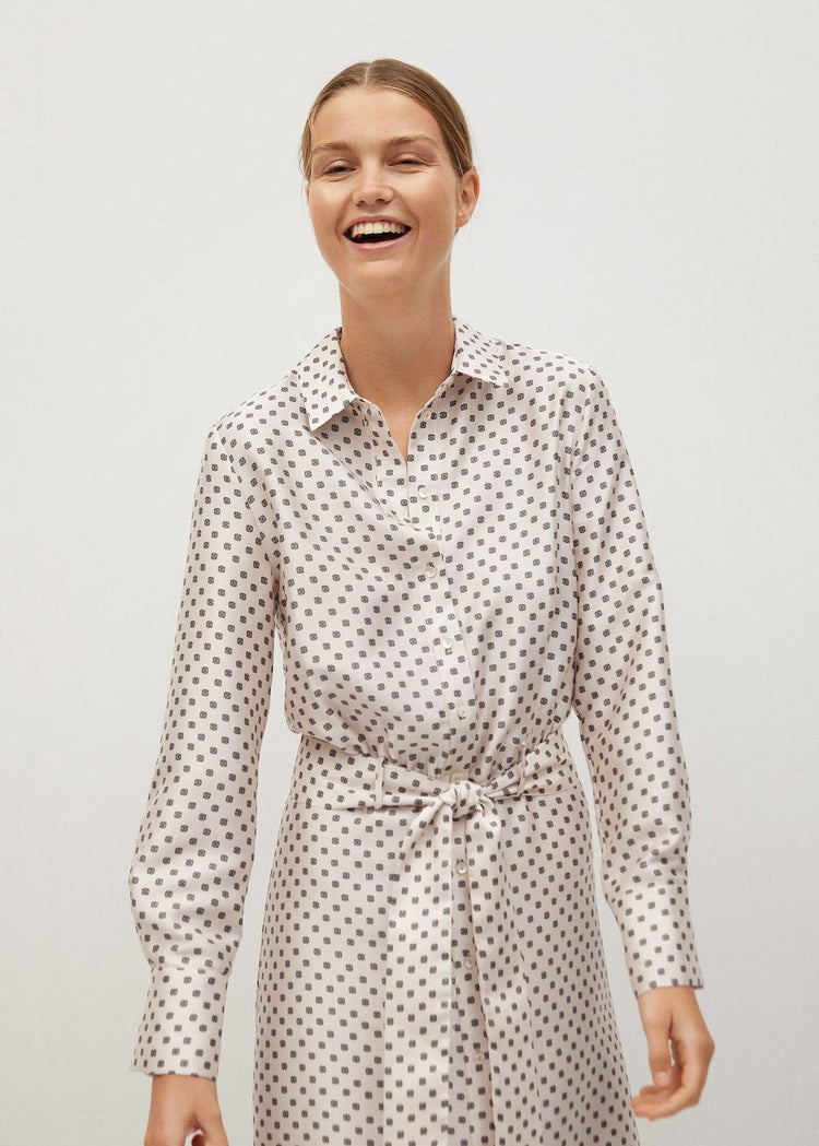 Shirt-style. Printed design. Flared design. Lapel-collar. Long sleeve with buttoned cuffs. Loops. Removable printed belt. Button fastening on the front section.