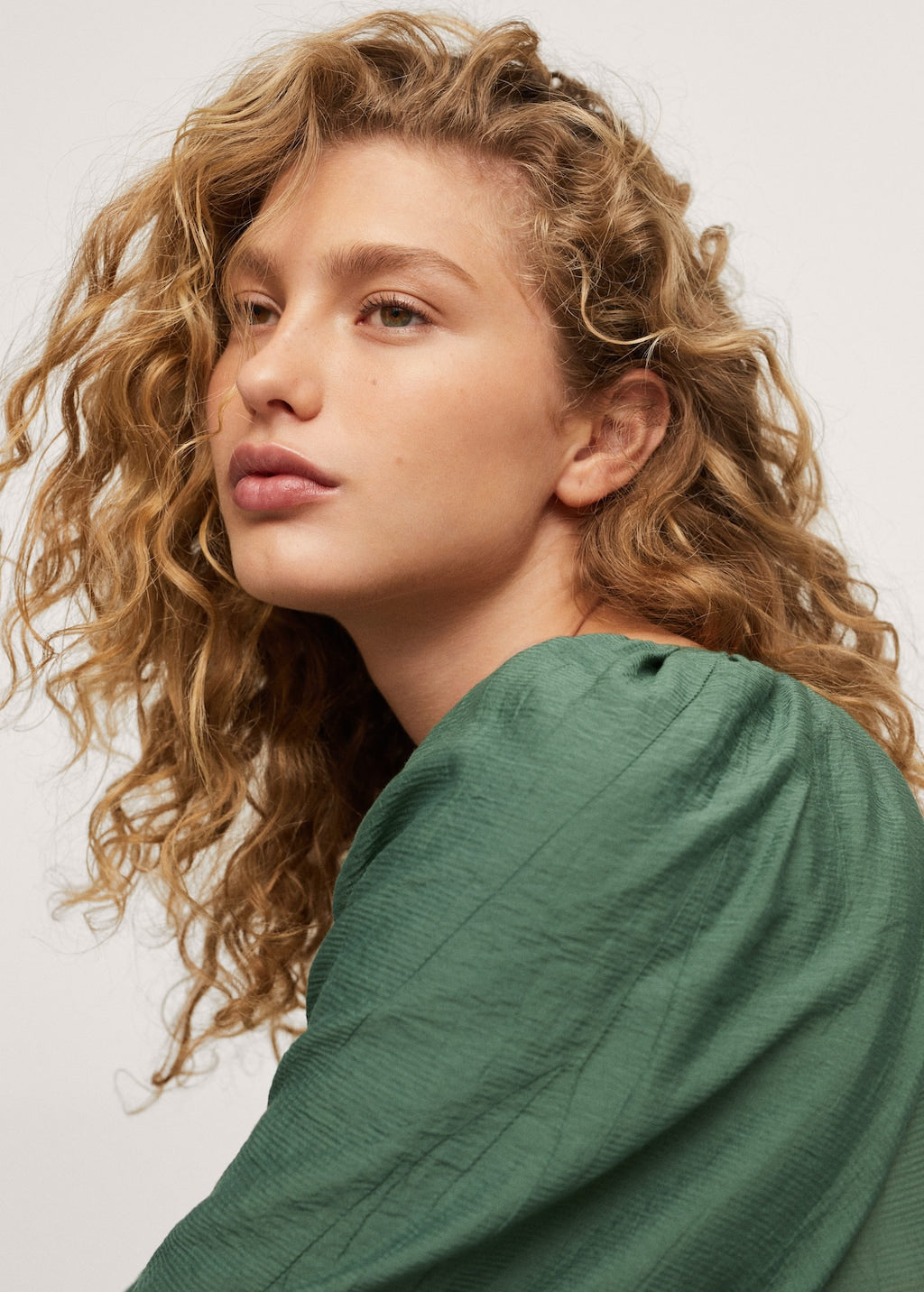 Flowy fabric. Short design. V-neck. Long puffed sleeves. Adjustable waist tie. Frill on the bottom. Interior cotton lining.