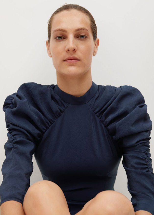 Satin. Midi design. Straight design. Rounded neck. Puffed three quarter sleeves. Zip fastening on the back section. Party collection.