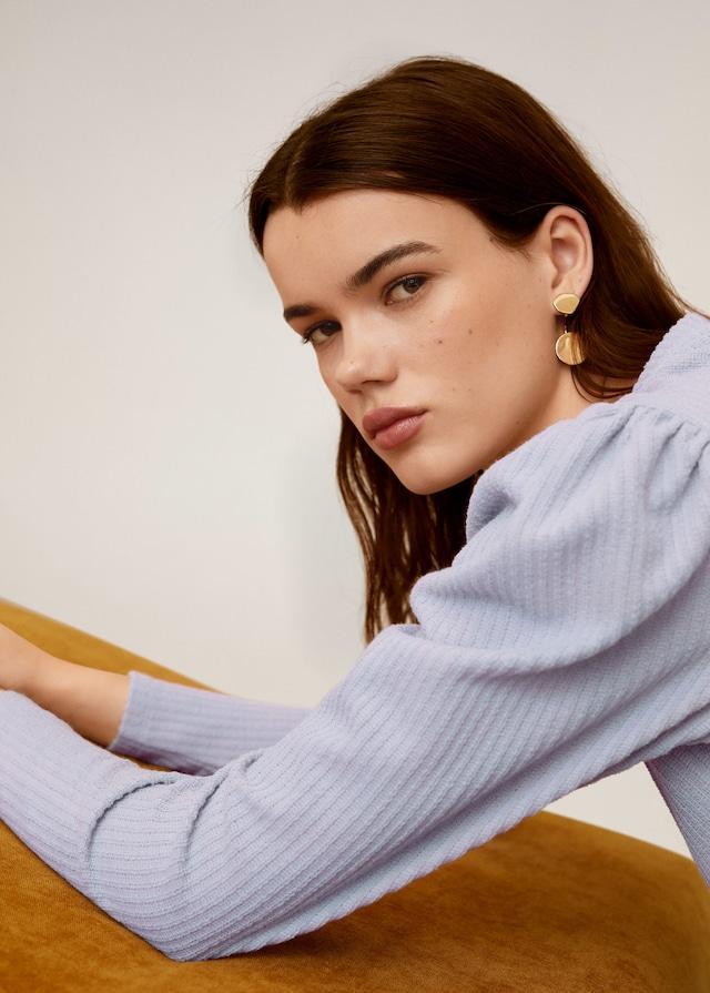 Textured fabric. Rounded neck. Long puffed sleeves.