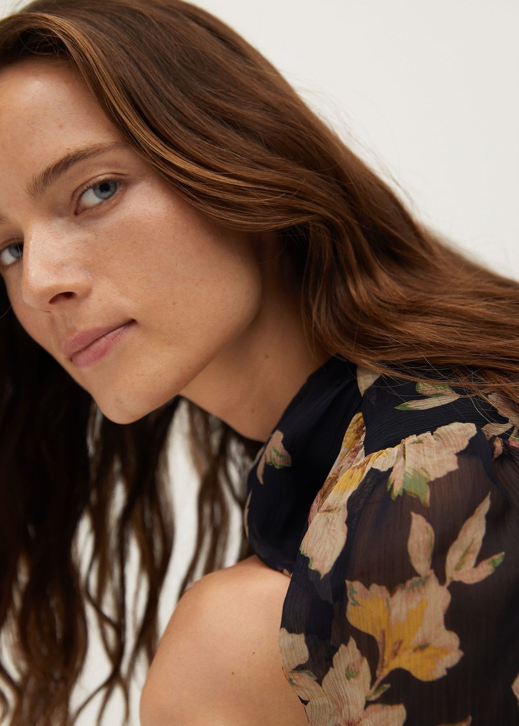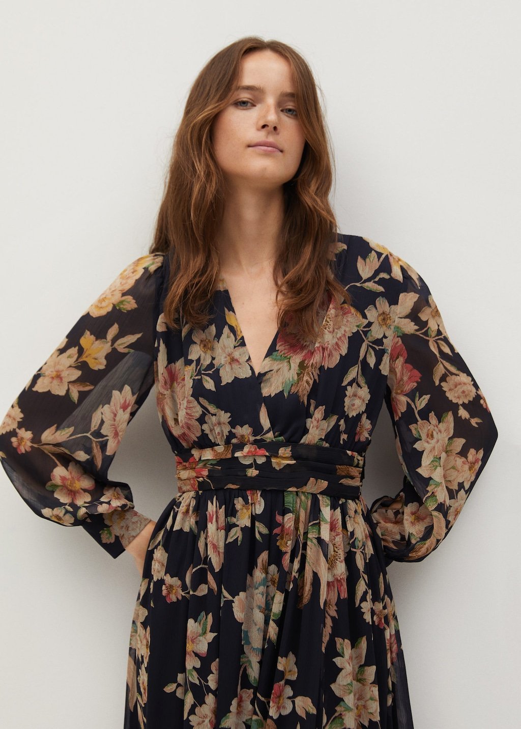 Recycled polyester material. Flowers print. Long design. Flared design. V-neck. Long puffed sleeves. Buttoned cuffs. Pleats detail. Inner lining.