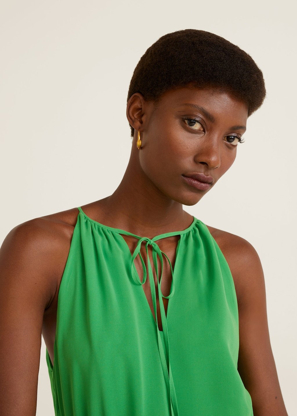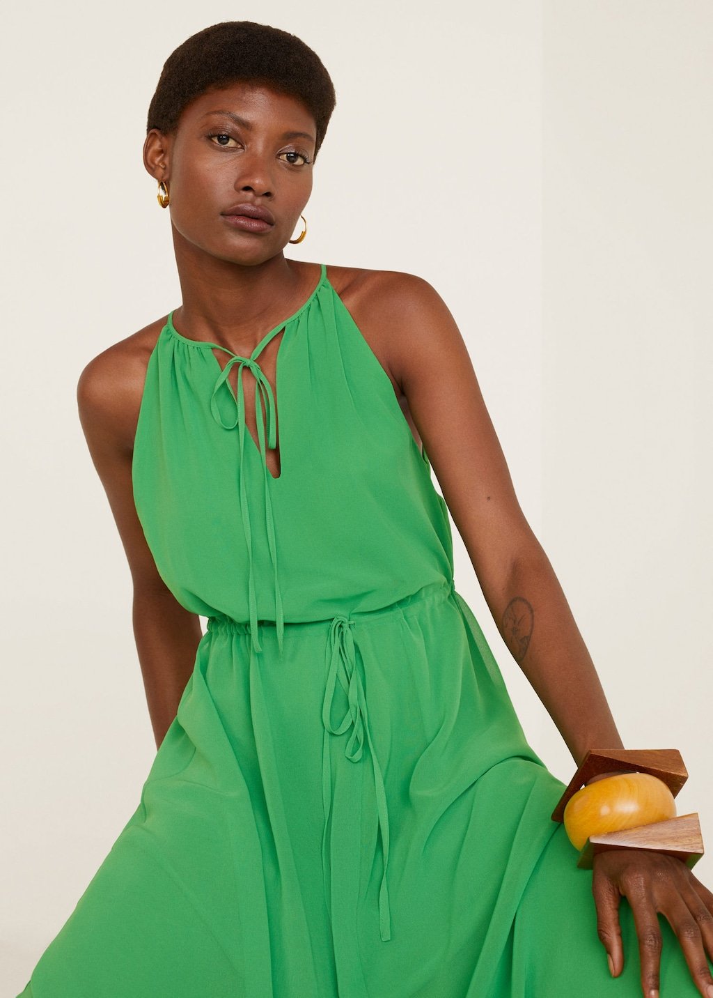 Long design. Flared design. Sheer fabric. Halter neck. Bow fastening on the neck. V-neck. Sleeveless. Drawstring waist. Inner lining.