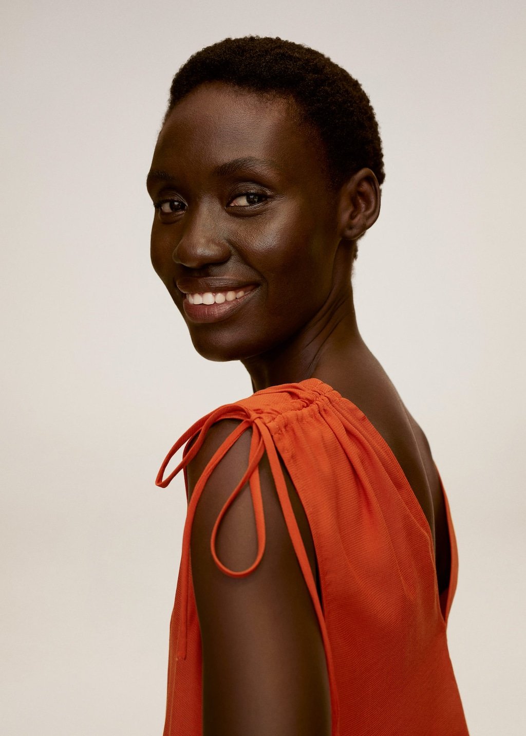 Flowy fabric. V-neck. Wide straps. Gathered detail. Side bow fastenings.