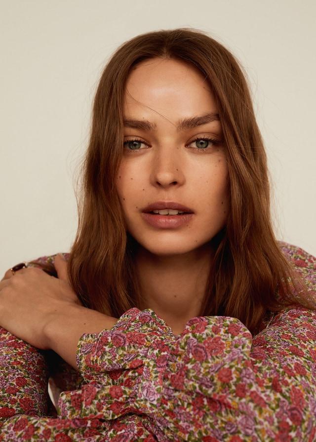 Flowy fabric. Floral print. Crossover design. V-neck. Long sleeve. Ruffles on the sleeves. Drawstring closure.