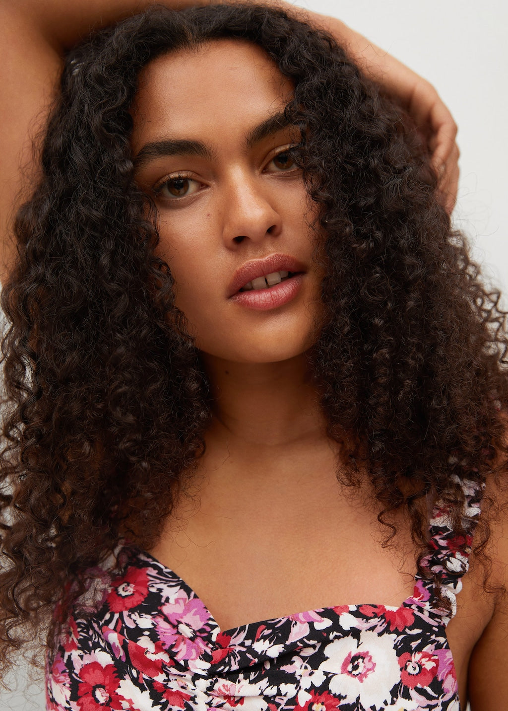 Flowy fabric. Long design. Flared design. Printed design. Floral print. Sweetheart neckline. Elastic straps. Runched detail in the neckline. Frill on the bottom. Invisible back zip fastening.