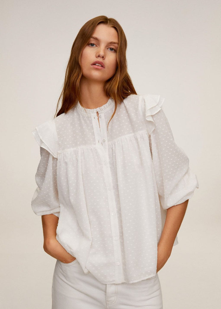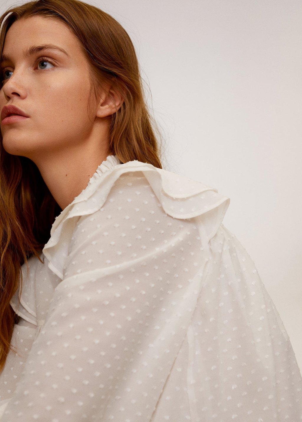 Embroidered dots. Rounded neck. Ruffles detail on the neck. Frill detail on the shoulders. Long sleeve with elastic cuffs. Button fastening on the front section. Decorative pleats at front. Inner lining.