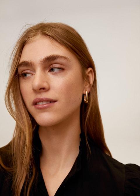 Flowy fabric. Mao neckline. Ruffles detail on the neck. Button up. Long sleeve with buttoned cuffs.