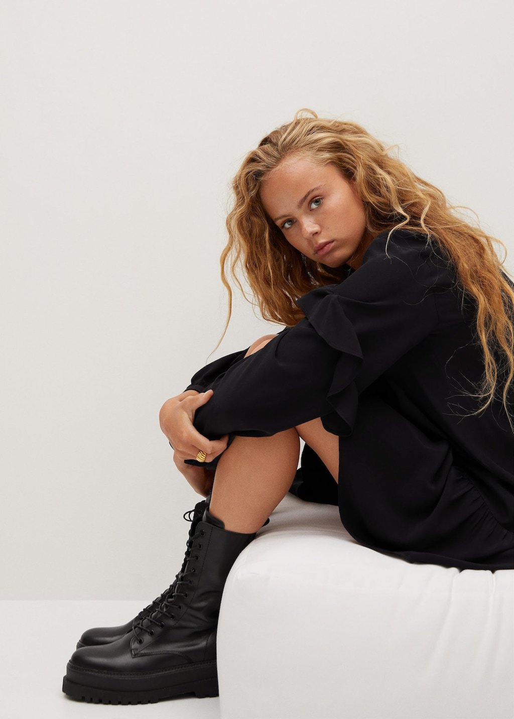 Flowy fabric. Flared design. Short design. V-neck. Long puffed sleeves. Ruffle details. Frill on the bottom.