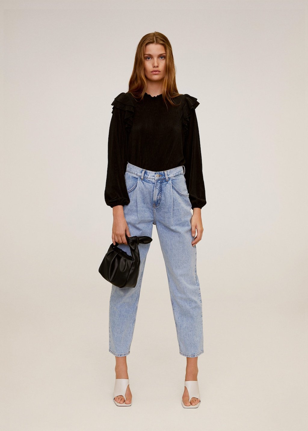 Pleated fabric, decorative frill detail, rounded neck with pleated detail, long sleeve, wide sleeve, elastic cuffs, button fastening at back.