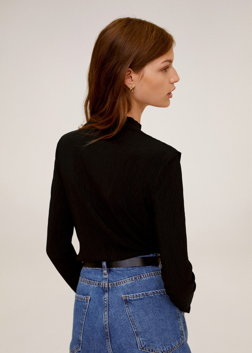 Pleated fabric. Decorative frill detail. High collar. Long sleeve.