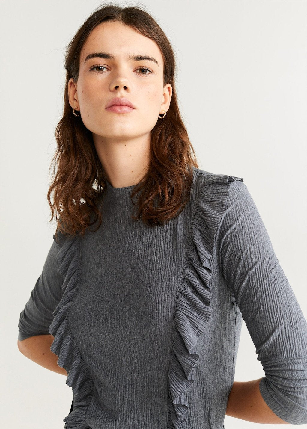Pleated fabric. Decorative frill detail. High collar. Long sleeve.