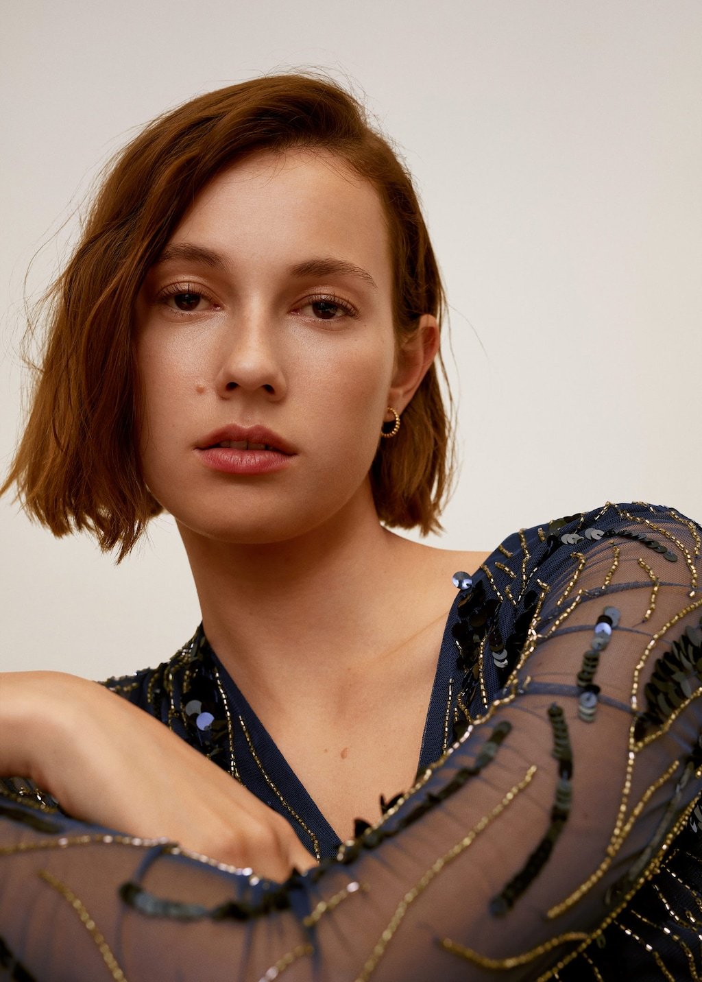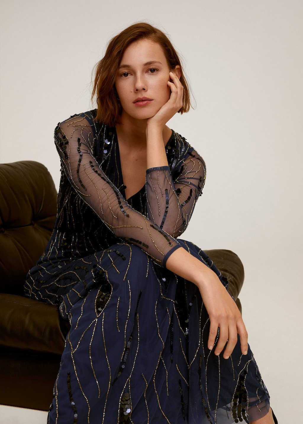 Long design. Straight design. Microbead embroidered appliqués. Embroidered with sequins. V-neck. Long sheer sleeve. Fitted waist. Inner lining. Zip fastening.