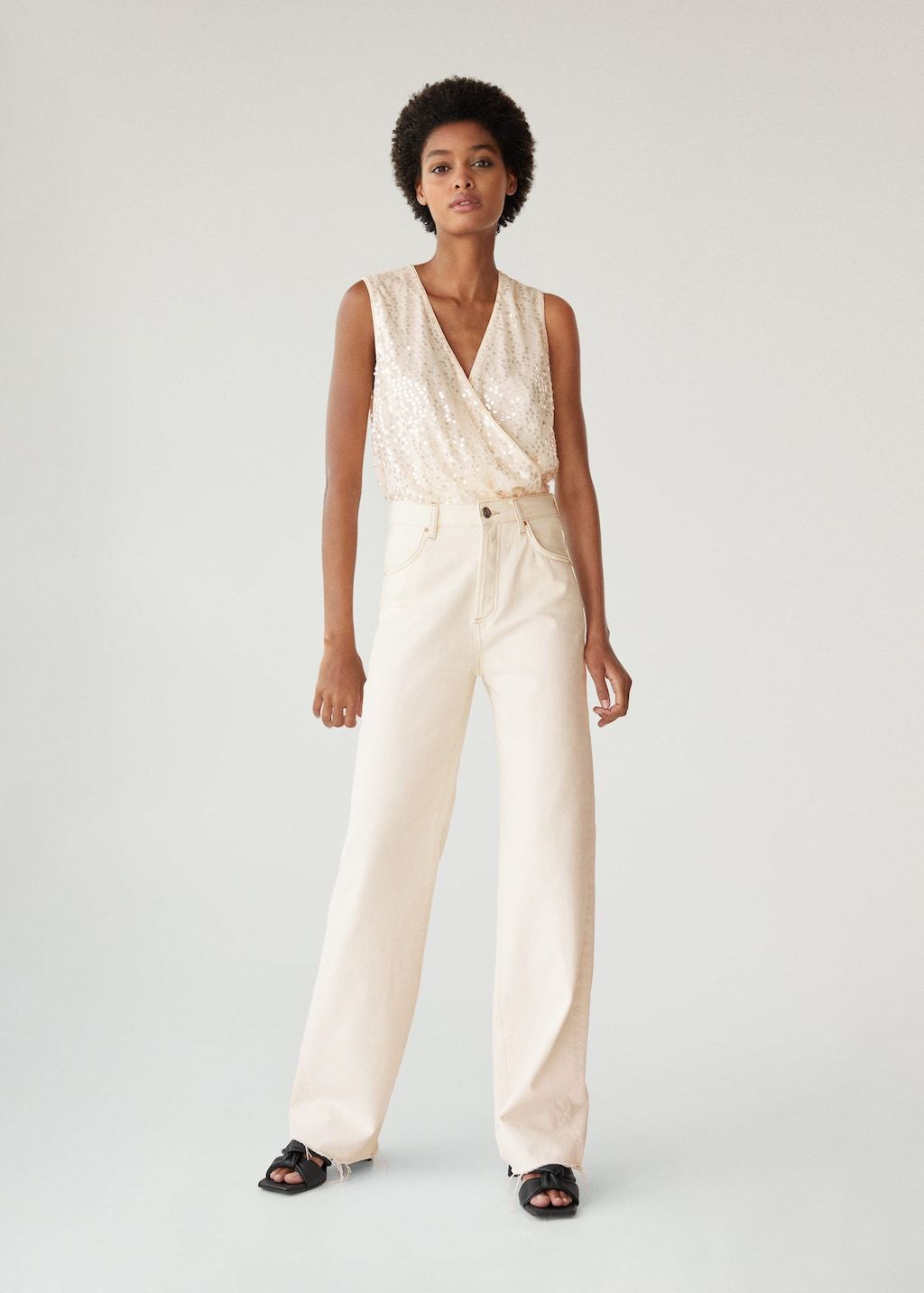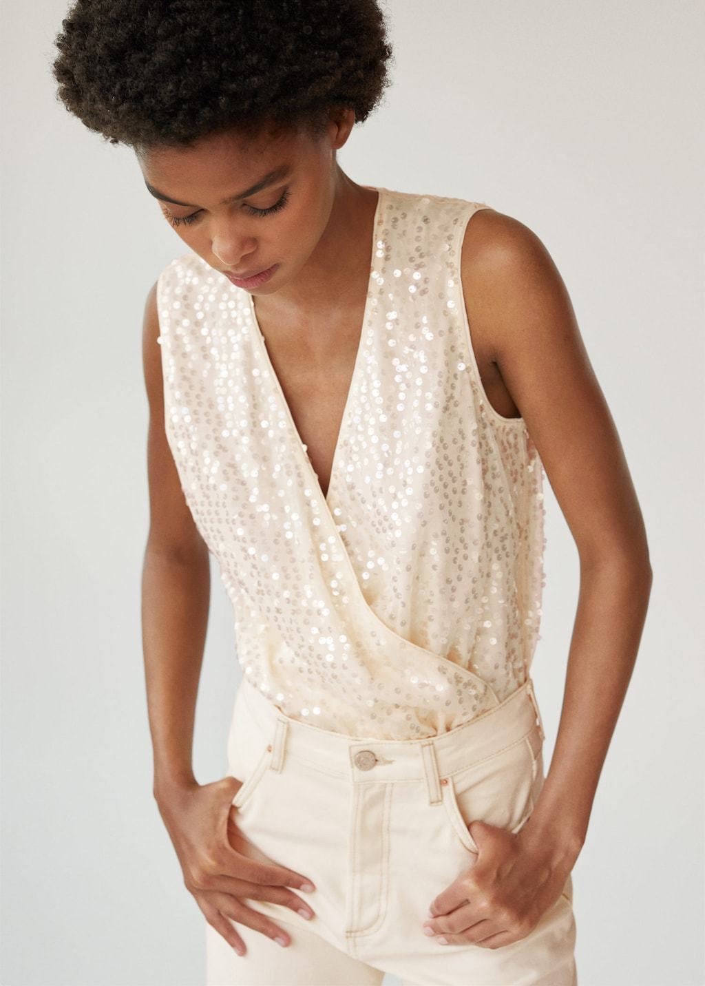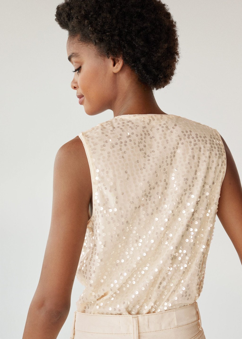 Sequin fabric. Wrap collar. Sleeveless. Inner lining. Popper fastening on the pantie.