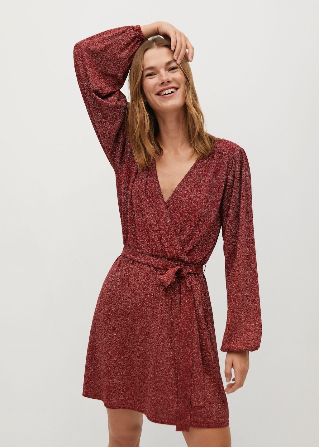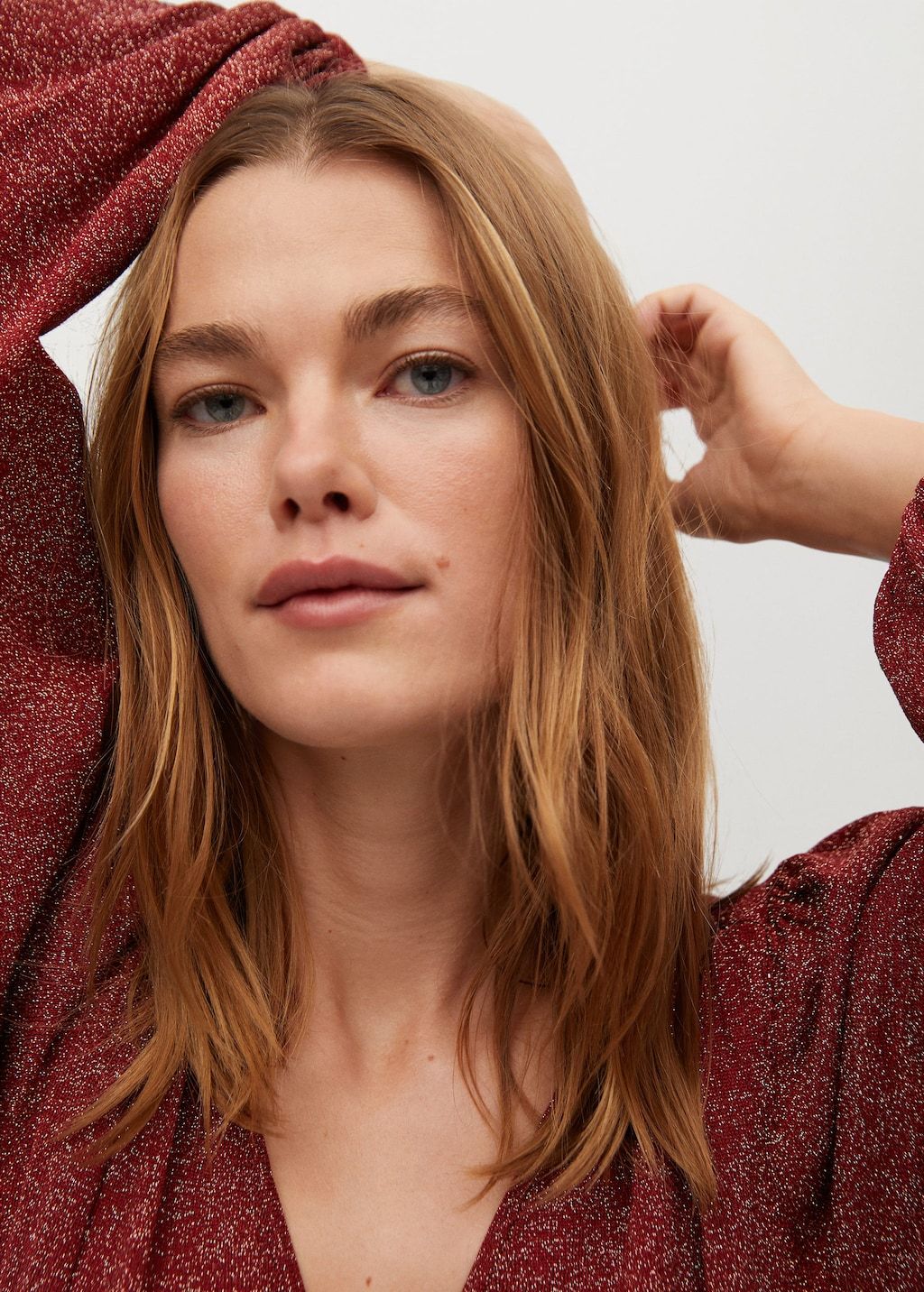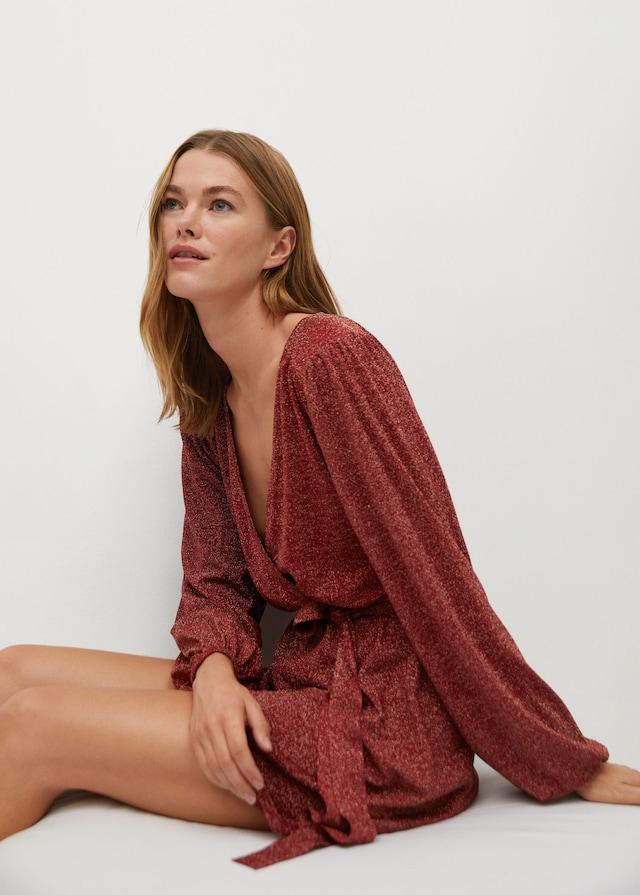 Shiny finish. Crossover design. Short design. V-neck. Long puffed sleeves. Elastic cuffs. Loops. Removable belt.