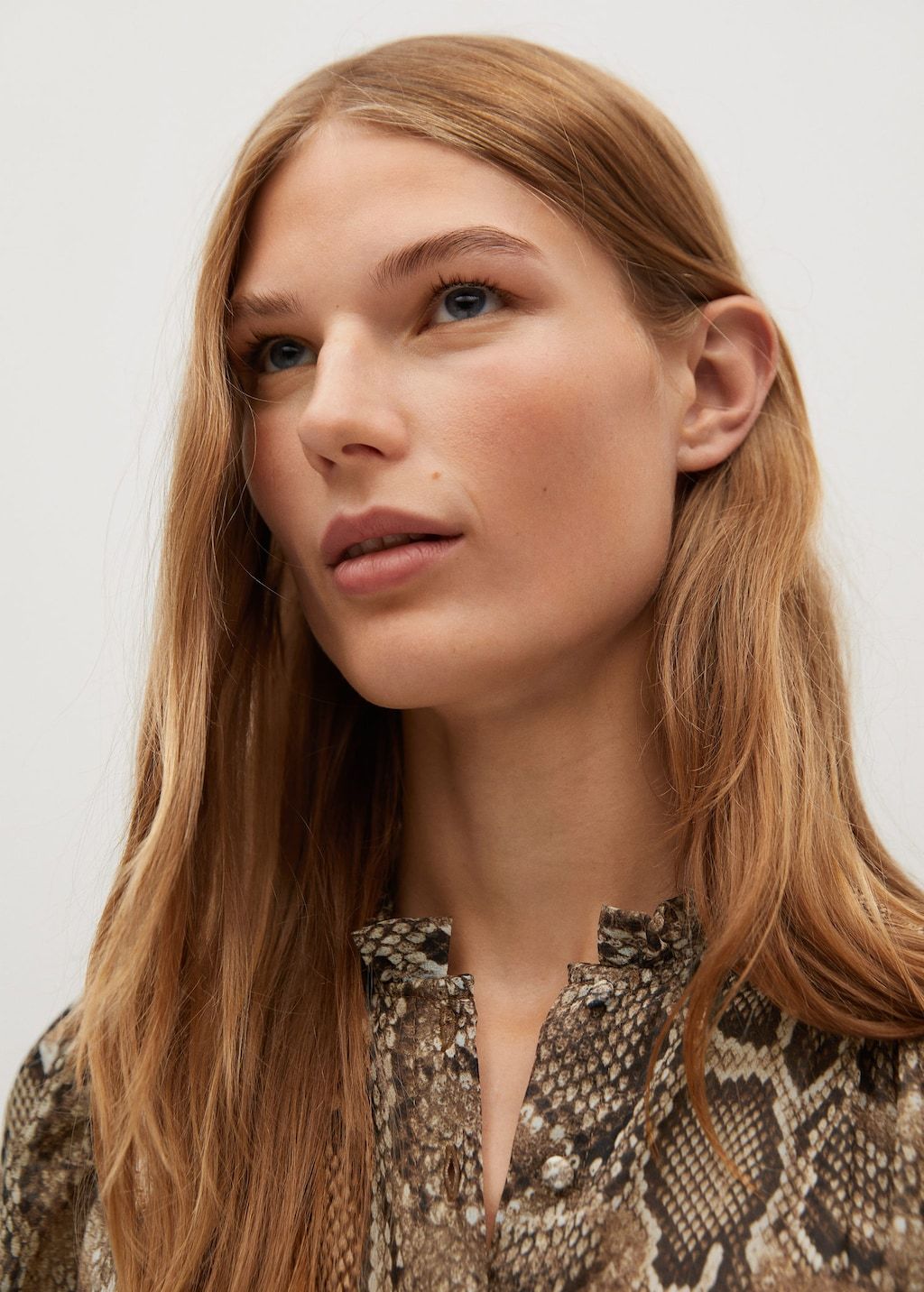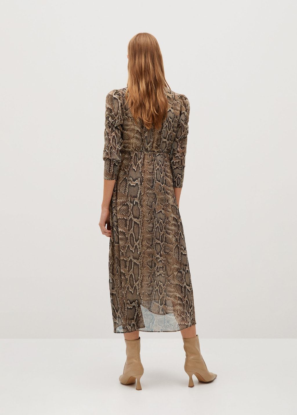 Flowy fabric. Snake print. Long design. Flared design. Ruffles detail on the neck. Long puffed sleeves. Ribbon on the waist with tie closure. Button fastening on the front section. Inner lining.
