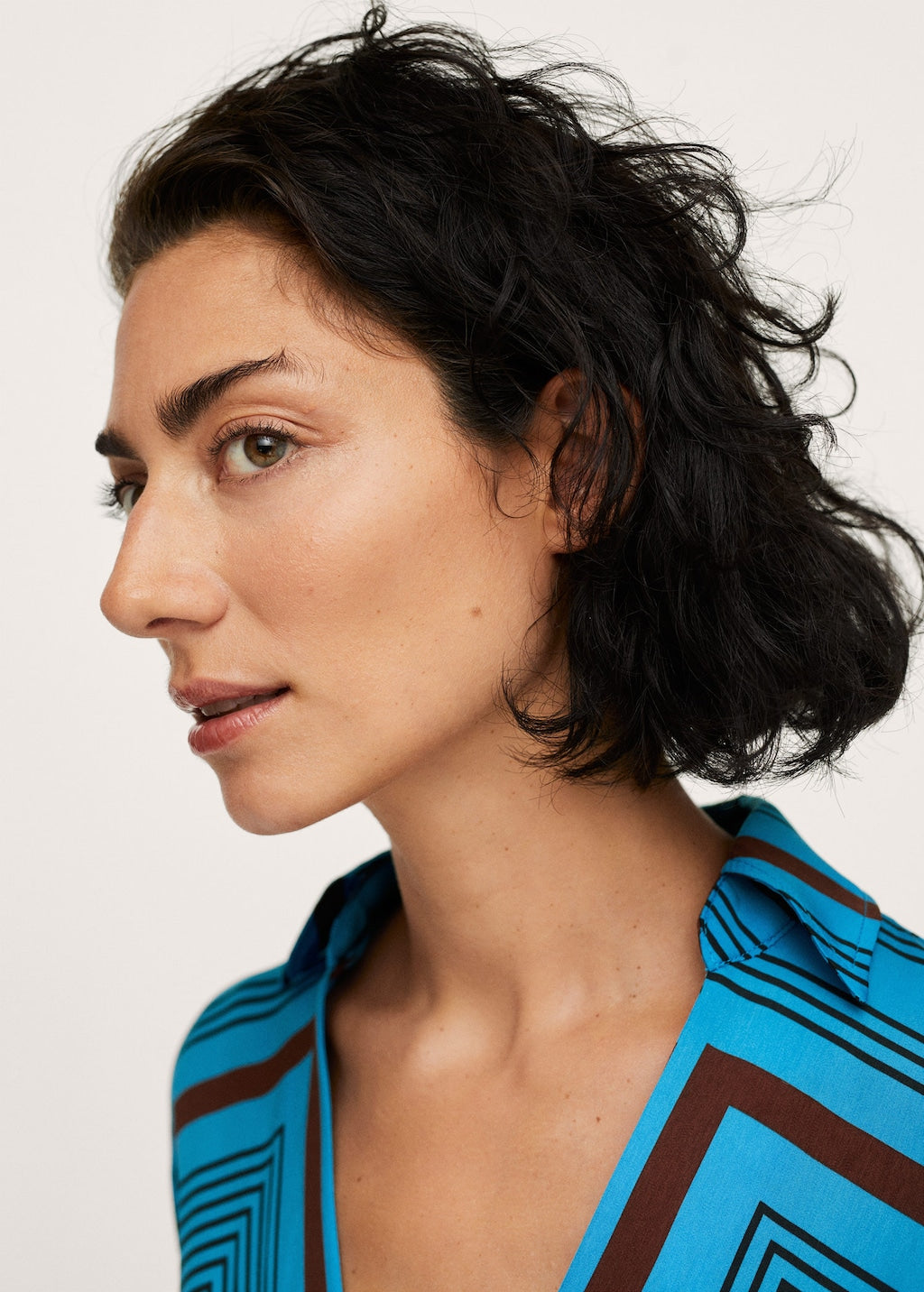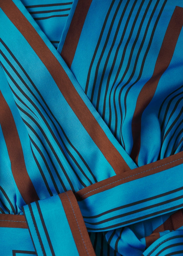 Flowy fabric. Satin. Printed design. Geometric print. Midi design. Flared design. Crossed V-neck. Long sleeve with buttoned cuffs. Loops. Adjustable waist tie. Pleated skirt.