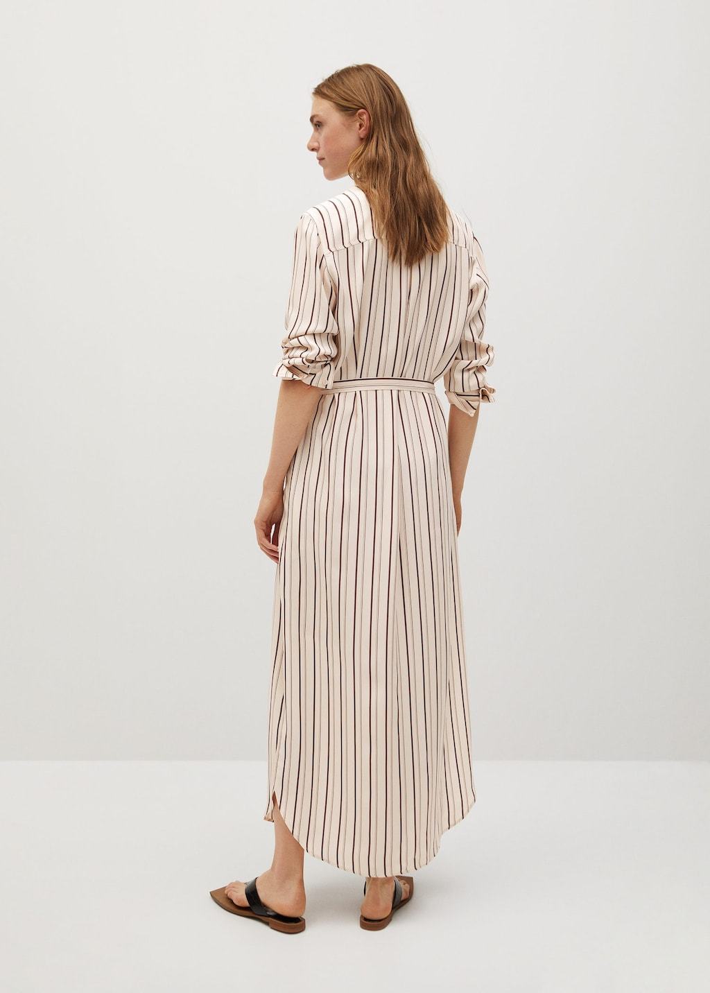 Stripped fabric. Flared design. Lapel-collar. Lapel with notch. Two front pockets. Long sleeve with buttoned cuffs. Adjustable belt. Side slits. Button up.