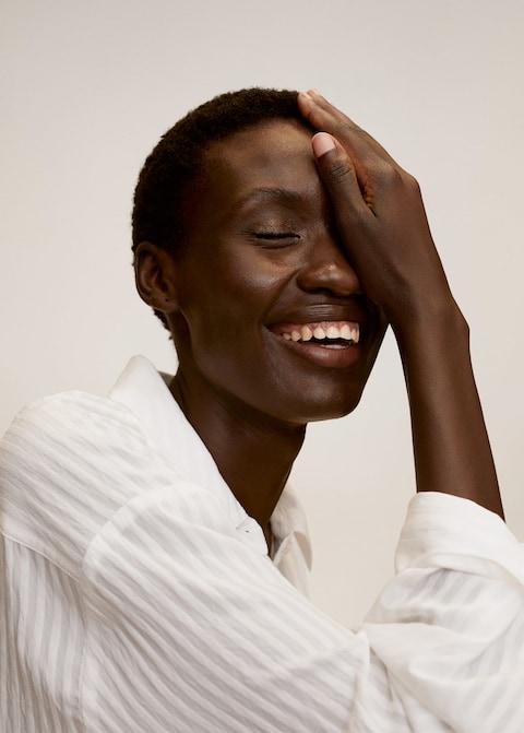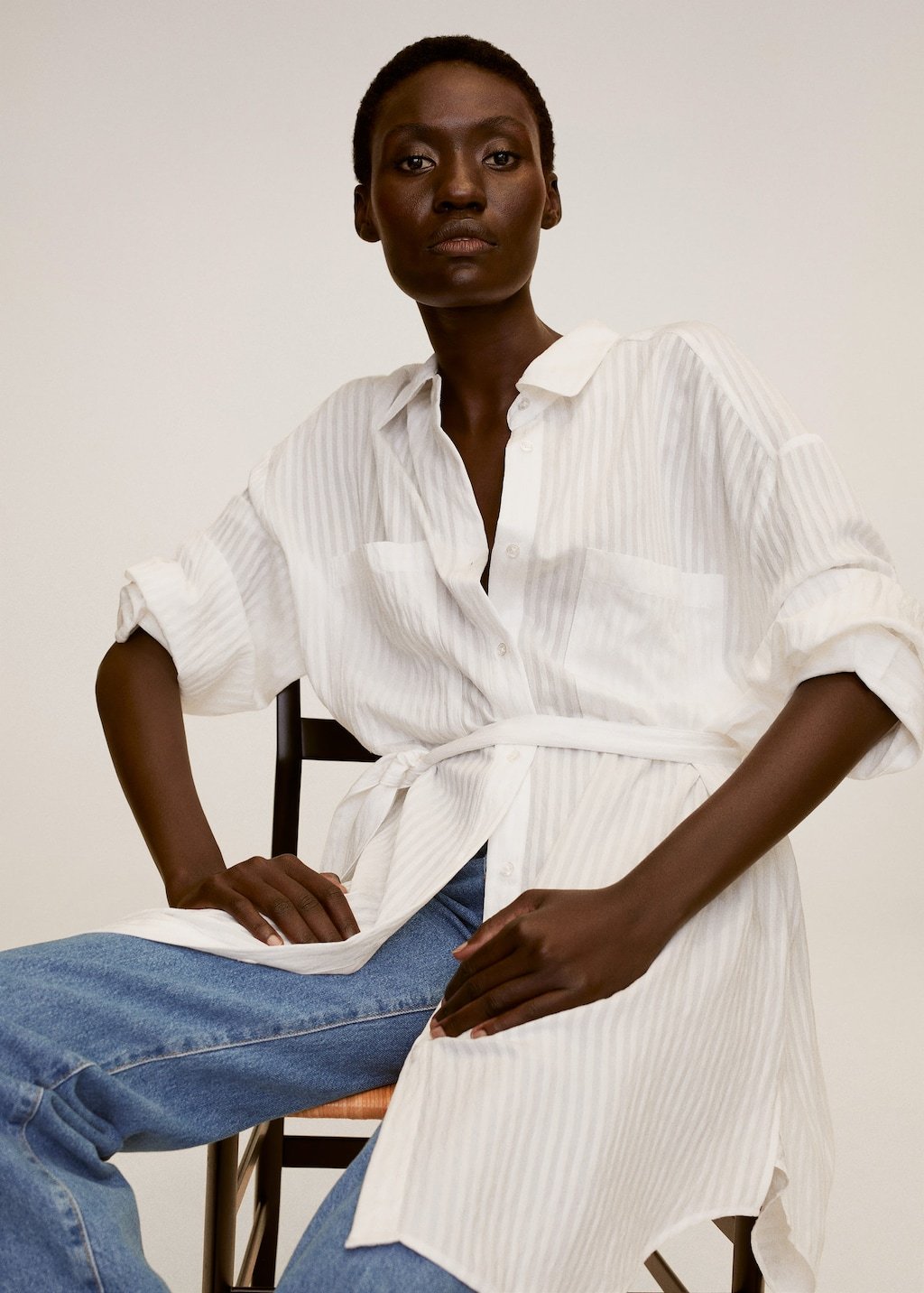Oversize style. Textured design. Classic collar. Long sleeve with buttoned cuffs. Button fastening on the front section.