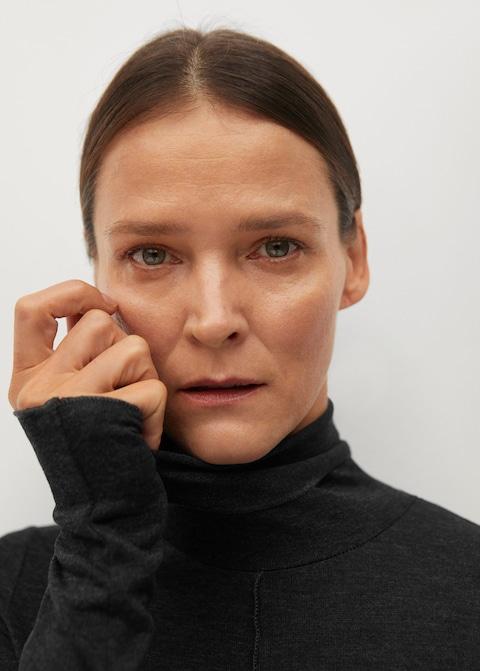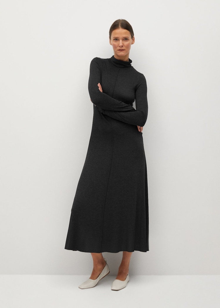Knitted fabric. Midi design. Flared design. Turtleneck. Long sleeve.