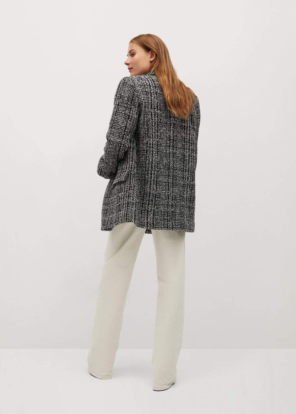Tweed fabric. Structured. Lapel-collar. Long sleeve with buttoned cuffs. Side flap pockets. Button fastening on the front. Inner lining.