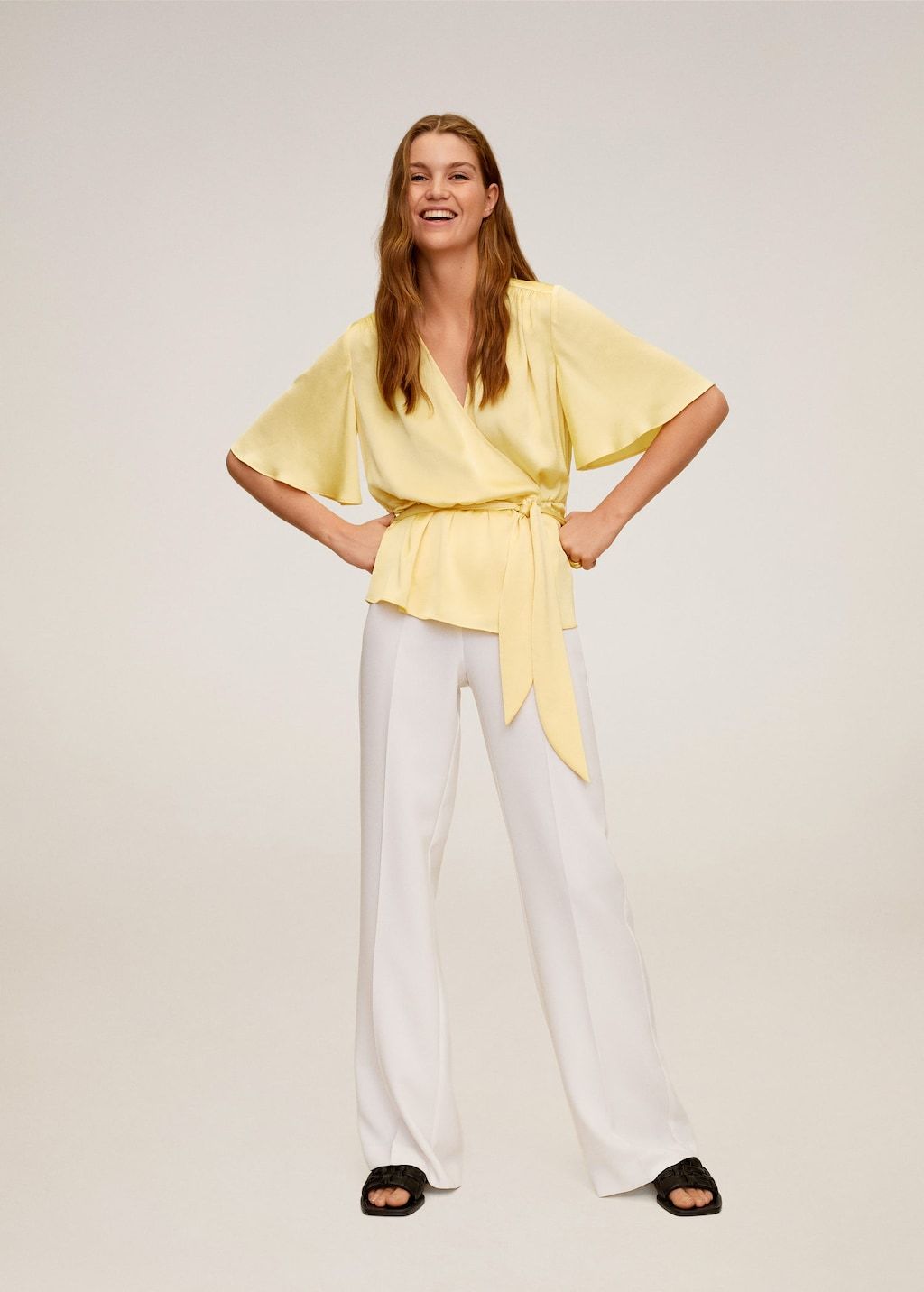 Flowy fabric. Wrap neckline. Pleated details. Flared short sleeve. Decorative belt. One button fastening.